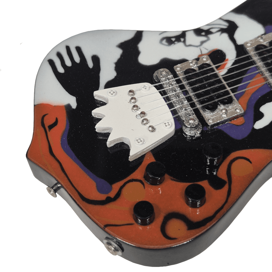 This is an unlicensed, handmade miniature replica guitar. It is for display purposes only and cannot be played.